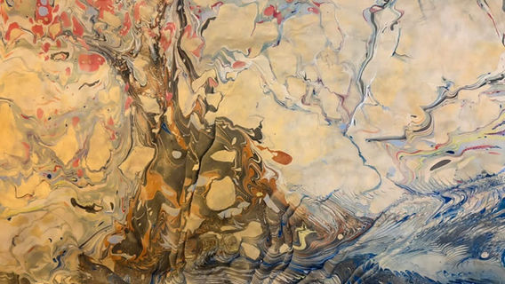 Wild Marbling is a journey through inner and outer landscapes rooted in the natural world and inspired by liminal spaces and place. By floating pigment on water and creating patterns made through reciprocity with the natural world (movement and memory, vibrations of land and breath), as well as manipulations with marbling combs and styluses and other tools, I create monotype prints that express the unique realities of the current moment. My work is a celebration of edge effect evolution and ecotones and the transitional energy and chaos therein and furthers an investigation of how these marbling styles might interact and engage in new ways of being.